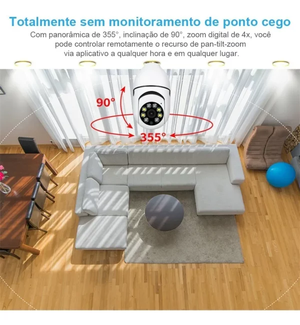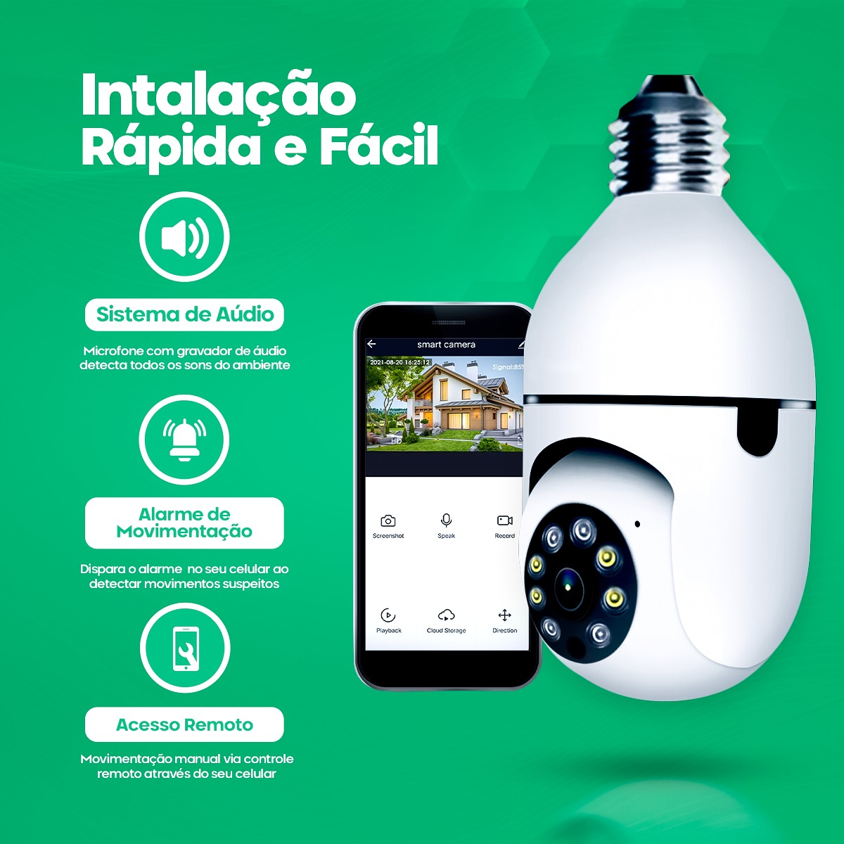 – Sistema extremamente simples de instalar, basta colocar em um bocal de lâmpada comum, tem o tamanho e formato de uma lâmpada de led comum, discreto. Conecta-se a sua rede wifi e a partir daí você pode visualizar e interagir de qualquer lugar do mundo através do seu celular ou tablet. Se alguém entra no ambiente você receberá uma mensagem em seu telefone e poderá visualizar/interagir com a pessoa.