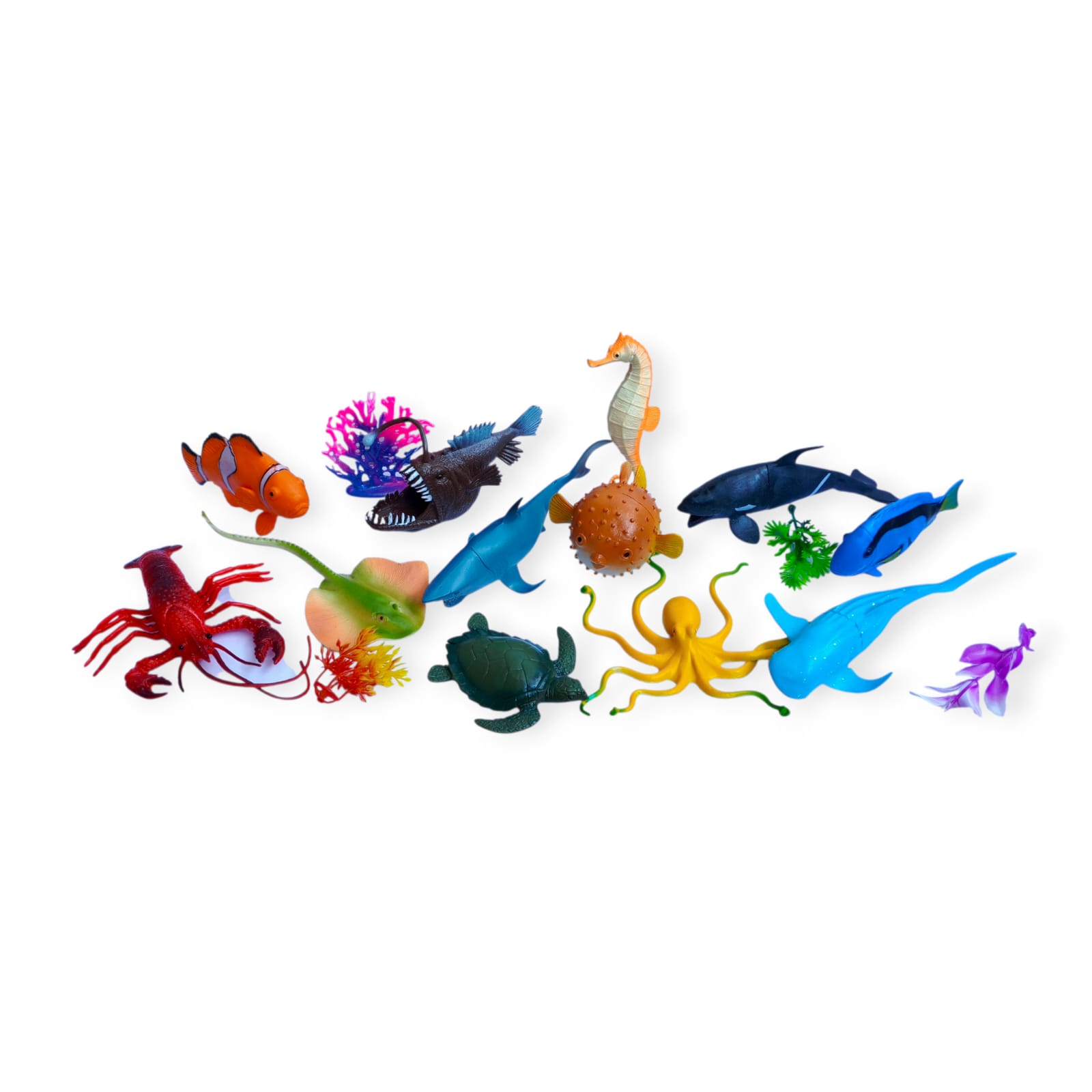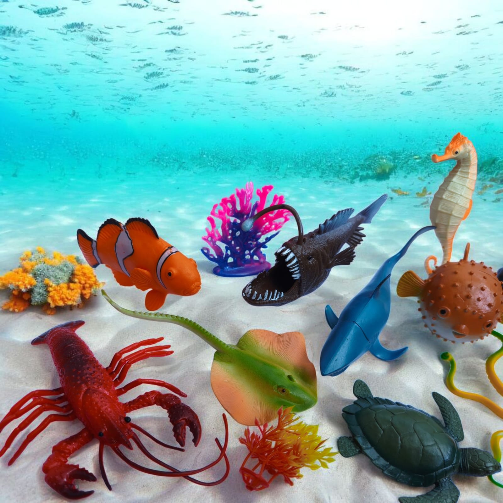 Kit com 12 Miniaturas de Animais Marinhos + Algas de Plástico | Brinquedo Educativo Infantil 🌿