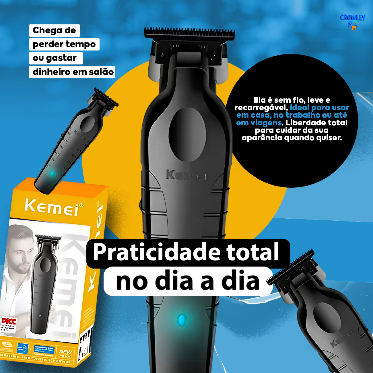 **** MÁQUINA DE ACABAMENTO KEMEI 2299 PROFFISIONAL *** PRODUTO ORIGINAL !!!! VEJA NOSSAS AVALIAÇÕES NO FINAL DA PAGINA CUIDADO COM PREÇO BAIXO, EXISTEM COPIAS DA MAQUINA NA PLATAFORMA !!! A Máquina de Acabamento Kemei Profissional KM-2299 é a escolha ideal para quem busca precisão e qualidade no cuidado pessoal. Com um design ergonômico e leve, ela proporciona um manuseio confortável, tornando o processo de corte de cabelo e barba uma experiência agradável. Seu funcionamento sem fio e a bateria recarregável garantem liberdade de movimento, perfeita para uso em casa ou em viagens. Inclui três pentes de diferentes tamanhos, permitindo versatilidade nos estilos de corte. As cabeças removíveis e laváveis facilitam a limpeza, assegurando a durabilidade do produto. Acompanha fio USB, manual e óleo lubrificante, oferecendo tudo o que você precisa para um desempenho excepcional. Ideal para acabamentos precisos, a Kemei KM-2299 é adequada para cortes de cabelo e barba, atendendo às necessidades de profissionais e entusiastas. Com uma única posição de corte, é fácil de usar e perfeita para quem busca resultados de qualidade em pouco tempo. Invista na sua aparência com esta máquina de acabamento que combina eficiência e praticidade. FICHA TÉCNICA – Modelo: KM-2299 – Voltagem: Bivolt (110-220V, 50/60Hz) – Potência: 5W – Bateria: Lítio 1200mAh – Tempo de Recarga: 3 horas – Uso Contínuo: Até 3 horas – Lâmina: Aço carbono ITENS INCLUSOS 1 – Máquina de cortar cabelo KM-2299 1 – Protetor de lâmina 3 – Pentes de diferentes tamanhos 1 – Cabo carregador USB 1 – Pincel de limpeza 1 – Manual de instruções Boas compras !!